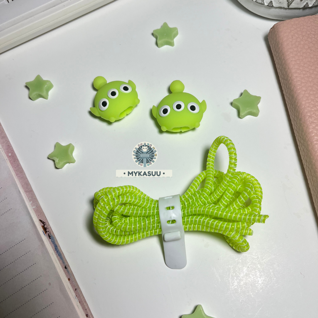 ¡Una protección de otro mundo! 🚀 Protege tus cables con el estilo galáctico de los Marcianos de Toy Story. Incluye organizador en espiral y protectores para extremos en color verde neón.